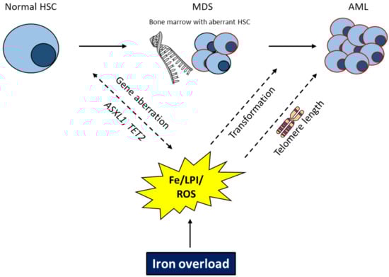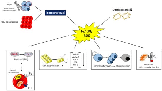 - Jin, X.; He, X.; Cao, X.; Xu, P.; Xing, Y.; Sui, S.; Wang, L.; Meng, J.; Lu, W.; Cui, R.; et al. Iron overload impairs normal hematopoietic stem and progenitor cells through reactive oxygen species and shortens survival in myelodysplastic syndrome mice. Haematologica 2018, 103, 1627–1634. [Google Scholar] [CrossRef] [PubMed]