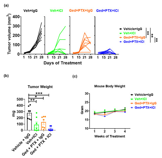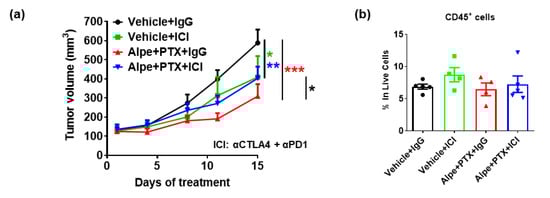 The PI3Kα inhibitor, alpelisib, has shown some promise for treatment of ER+ breast cancer in combination with fulvestrant [13]. In addition, alpelisib combined with CDK4/6 inhibition enhances response to ICI in pRb+ triple-negative BCs [14]. Since PI3Kα is frequently mutated or activated in BCs, we chose to investigate the effects of alpelisib combined with PTX in response to ICI (anti-PD-1 and anti-CTLA-4) using a luminal, TNBC-like PyMT orthotopic implantation mouse model of breast cancer in C57BL/6 mice. Treatment of PYMT tumor-bearing mice with (1) vehicle for alpelisib and vehicle for PTX + IgG, (2) alpelisib (50 mg/kg) + PTX (10 mg/kg) + IgG, (3) vehicles + ICI (200 ug anti-PD-1 and 100 ug anti-CTLA-4), or (4) alpelisib + PTX + ICI was initiated when the tumors were ~125 mm3, and continued for 2 weeks. After 2 weeks of treatment, there was a significant reduction in tumor volume of mice treated with vehicles + ICI (p = 0.02), alpelisib + PTX + IgG (p < 0.001), and alpelisib + PTX + ICI (p = 0.004) compared to vehicles + IgG-treated mice (Figure 1a). In addition, a significant reduction in tumor volume was observed in mice treated with alpelisib + PTX + IgG compared to ICI + vehicle-treated mice (p = 0.05). However, there was no significant difference in the tumor volume of mice treated with alpelisib + PTX + ICI versus alpelisib + PTX + IgG or with vehicles + ICI, suggesting that the addition of ICI to PI3Kα inhibitor plus PTX did not improve the response to ICI alone in mice bearing PyMT tumors.