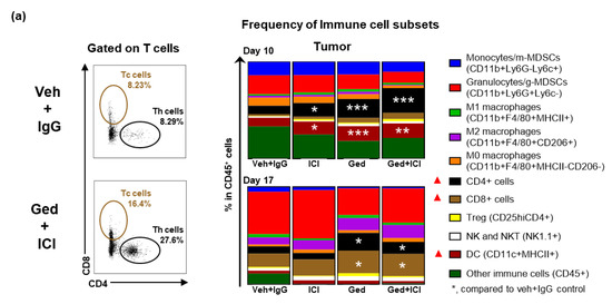 FACS analyses were performed to characterize immune cell subpopulations in tumors at early (10 days) and late (17 days) treatment stages (Figure 4a). At the early treatment timepoint, there was a significant induction of CD4+ T cell content in the tumors with treatments of vehicle + ICI (13.7%, p = 0.01), gedatolisib + IgG (19.6%, p = 0.0002), or gedatolisib + ICI (25.5%, p < 0.0001), compared to vehicle + IgG (8.6%). While vehicle + ICI (6.9%, p = 0.743) did not maintain the increased level of CD4+ T cells at the late treatment timepoint, gedatolisib + IgG (19.2%, p = 0.014) or gedatolisib + ICI (12.4%, p = 0.041) resulted in a durable CD4+ T-cell response as observed in the late treatment timepoint, compared to vehicle + IgG (7.4%). In addition, there was a significant induction of CD8+ T cells at the late treatment timepoint in the tumors treated with gedatolisib + IgG (24.5%, p = 0.02) or gedatolisib + ICI (22.8%, p = 0.05) compared to vehicle + IgG (13.6%). Accompanied with the treatment-induced T-cell responses, the frequency of DCs in the TME was promoted at the early timepoint of treatments with vehicle + ICI (13.14%, p = 0.02), gedatolisib + IgG (15.36%, p = 0.0002), or gedatolisib + ICI (14.88%, p < 0.0001), compared to vehicle + IgG (9.0%). Besides increased frequency of T cells and DCs in the TME, gedatolisib + ICI treatment also induced a 1.5–2-fold increase in the activation (CD69+) of CD8+ Tc cells (Figure 4b, p = 0.0219 at day 10, p = 0.0198 at day 17) and NK cells (Figure 4c, p = 0.0050 at day 10, p = 0.0308 at day 17) compared to vehicle + IgG at both early and late treatment timepoints. There was a clear induction of granulocytic population and M2 macrophages in the tumors at day 17 compared to day 10, which was independent of therapy types and could be a potential mechanism of resistance in the residual tumors.