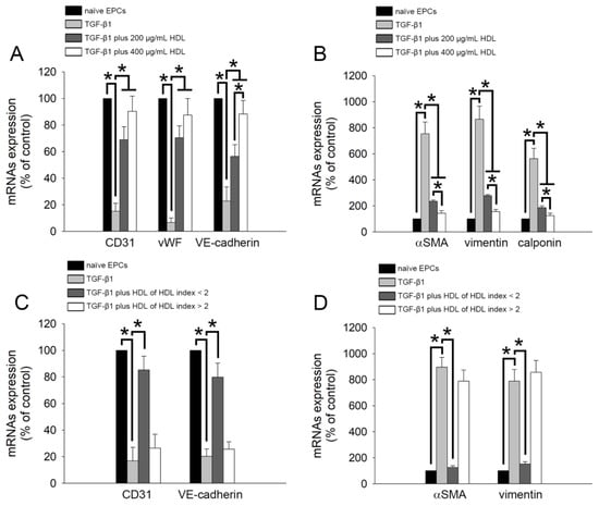 HDL can inhibit the TGF-β1-mediated EndoMT, and this effect is determined by the quality of HDL. (A,B) Human EPCs were exposed to 10 ng/mL recombinant human TGF-β1 for 5 days without or with HDL (200 or 400 μg/mL HDL from healthy volunteers) treatment (black: naïve EPCs; light grey: TGF-β1; dark grey: TGF-β1 plus 200 μg/mL HDL; white: TGF-β1 plus 400 μg/mL HDL). The mRNA expression of the genes encoding CD31, vWF, VE-cadherin, α-SMA, vimentin, and calponin was evaluated using reverse transcription and qPCR analysis. (C,D) Human EPCs were exposed to TGF-β1 for 5 days with or without HDL (400 μg/mL HDL from patient with an HDL index < 2 or patient with an HDL index > 2) treatment (black: naïve EPCs; light gray: TGF-β1; dark gray: TGF-β1 plus HDL of HDL index < 2; white: TGF-β1 plus HDL of HDL index > 2). The mRNA expression of the genes encoding CD31, vWF, VE-cadherin, α-SMA, vimentin, and calponin was identified by reverse transcription and qPCR analysis. Five patient samples were used, and five independent experiments were performed (n = 5). The related mRNA expression (normalized to GAPDH mRNA expression) is presented as a bar graph. All data are expressed as the Mean ± Standard Deviation of five independent experiments and as the percentage of the control. Statistical evaluations were performed using the one-way ANOVA followed by Dunnett’s test. * p <0.05 was considered significant.