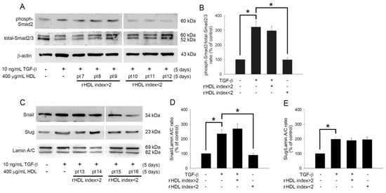 TGF-β1 induces phosphorylation and activation of Smad2/3, which is associated with EndoMT. Therefore, the effects of HDL on Smad2/3 activation in TGF-β1-treated EPCs were analyzed by western blotting. Figure 4A demonstrates that HDL from patients (7 to 9) with an rHDL index value > 2 could not inhibit Smad2 phosphorylation. However, HDL from patients (10 to 12) with an rHDL index value < 2 inhibited Smad2 activation in TGF-β1-stimulated EPCs. Snail and Slug are transcriptional factors that positively regulate the expression of EndoMT markers [] and mediate the loss of cell-cell adhesion in endothelial cells []. Therefore, we analyzed the impact of HDL on Snail and Slug activation. As shown in Figure 4C, TGF-β1 induced the activation of Snail and Slug, and the HDL from patients (15 and 16) with an rHDL index value < 2 inhibited the nuclear translocation of Snail; however, this effect was not observed in the presence of HDL from patients (13 and 14) with an rHDL index value > 2. Regardless of its type (higher or lower rHDL index), HDL had no effect on the activation of Slug in TGF-β1-induced EPCs. Based on these results, we conclude that HDL from patients with low rHDL index values can inhibit EndoMT by controlling the phosphorylation of Smad2/3 and activation of Snail transcription factors in EPCs; however, the role of other signaling pathways cannot be neglected. On the contrary, HDL has no effect on the activation of the Slug signaling pathway known to regulate EndoMT.