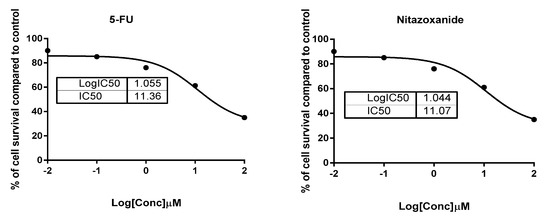 Both normal colon (FHC; ATCC® CRL-1831™) and colon cancer (HCT-116; ATCC® CCL-247™)) cells were procured from the American Type Culture Collection (ATTC) and maintained in Dulbecco’s Modified Eagle Medium/F-12 (DMEM⁄F12; cat no. D0547.DMEM⁄F12, Sigma-Aldrich, Saint Louis, MO, USA). Both cell types were provided with 2 mM L-glutamine (Catalog #: BE17-605E Lonza, Bornem, Belgium) and 10% fetal bovine serum (FBS) purchased from (CAT.NO.12103C Sigma-Aldrich, St. Louis, MO, USA), 1% penicillin/streptomycin (Lonza, Belgium). Cell incubation was done at 37 °C in a 5% carbon dioxide atmosphere (NuAire). Cell plating at a density equal to 5000 cells was undertaken in triplicate in a plate of 96 wells [46]. On the second day, cells were treated with 5-FU or nitazoxanide at the (0.01, 0.1, 1, 10, and 100 µM) concentrations. Cell viability was assessed after 48 h using MTT solution (Promega, Madison, WI, USA) [47]. 20 μL of MTT dye were transferred to wells and then incubation of the plate was allowed for a period of three hours. Colour intensity was subsequently read at 570 nm employing a BIO-Rad enzyme-linked immunosorbent assay (ELISA) microplate reader (iMark™ #1681130, BIO-Rad, CA, USA). The viability was calculated relative to a control and the IC50 values were determined using the GraphPad prism 7 as previously reported [48,49].