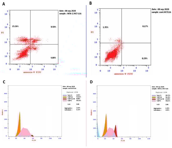 Cryptographs of annexin-V/propidium iodide staining. (A): untreated and (B): treated HCT-116 cells showing the apoptotic effect of nitazoxanide (IC50 = 11.07 μM, 48 h) in treated cells. Also, histograms DNA content-flow cytometry aided cell cycle analysis of (C): untreated and (D): treated HCT-116 cells with compound Nitazoxanide (IC50 = 11.07 μM) for 48 h of incubation.
