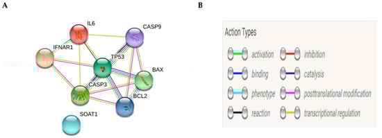 After accessing the website (http://string-db.org, accessed on 10 April 2021), we selected multiple protein query and wrote our desired set of proteins (p53, BAX, BCL2, caspase-3, caspase-8, caspase-9) sequentially then; we got a network view (Figure 3A) using the default setting to inspect cross-links weighted scheme to rank matched annotated proteins and finally, we collected evidence about our protein’s interaction by the linked colored lines between the proteins, as shown in (Figure 3B).