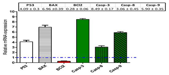 Real-time polymerase chain reaction (RT-PCR) analysis of the apoptosis genes. Assay was done using HCT-116 cells incubated with the IC50 of nitazoxanide. Dashed line represents the control (Fold change = 1), while β-actin as a housekeeping gene. ΔCT; the difference between the CT values of target genes and the housekeeping one (β-actin). ΔΔCT; The difference between mean values of genes CT values in the treated and control groups. Fold of change is an exponential function represented by 2^–ΔΔCT.