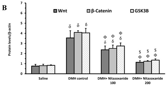 Western blot analysis for Wnt/β-catenin/glycogen synthase kinase-3β (GSK3) proteins. (A): Western blot gels of the target genes in (1) saline group, (2) 1,2-dimethylhydrazine (DMH) control group, (3&4) DMH + nitazoxanide 100 and 200 mg/kg groups, (B): Column charts for Wnt, β-catenin and GSK3B proteins relative to β-actin. Data are mean ± standard deviation (SD) and analyzed by one-way analysis of variance (ANOVA) and Bonferroni’s test. δ Compared to saline group, Φ Compared to DMH control group, $Compared to DMH + nitazoxanide 100 group, p < 0.05.
