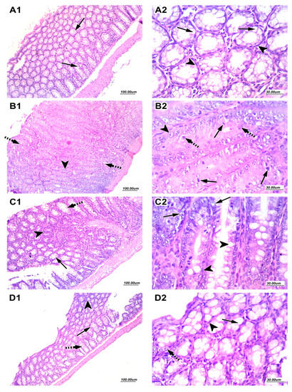 Hematoxylin and eosin (H&E)-stained sections of the saline group at low magnification (100×) showed regularly arranged colonic crypts with preserved goblet cells. High magnification (400×) showed a regular arrangement of epithelial cells with oval to flattened basal nuclei with regular nuclear membrane, fine chromatin, and cytoplasmic luminal mucin secretions (Figure 7A1 and Figure 6A2).
