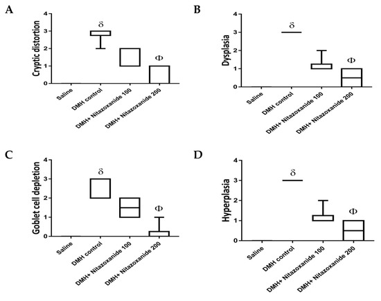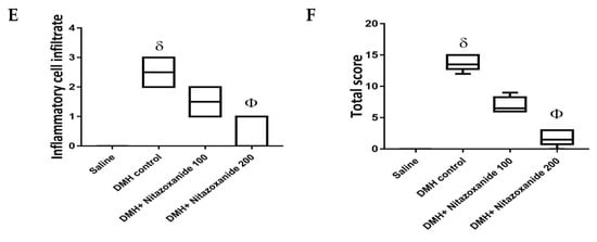 Histopathologic scoring data are demonstrated in Figure 8 and classified as cryptic distortion, dysplasia, goblet cell depletion, hyperplasia, inflammatory cell infiltrates as well as the sum of the 5 scores. The DMH control group showed significant increases in all the created individual scores and the total score compared to the saline group. Importantly, DMH+ nitazoxanide 200 mg/kg group showed significant reductions in all the 5 individual scores as well as the total histologic score (Figure 8A–F).