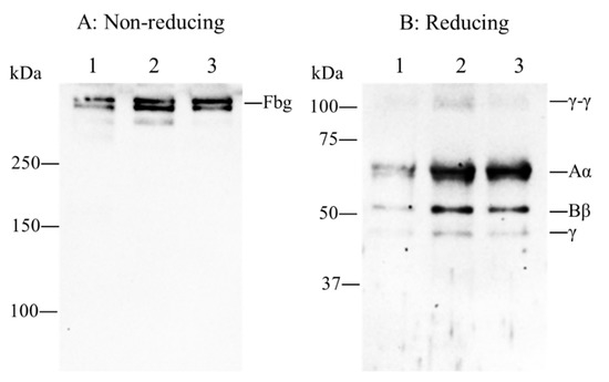 Immunoblotting analysis of plasma fibrinogen. One thousand-fold diluted plasma was separated by sodium dodecyl sulfate (SDS)-polyacrylamide gel electrophoresis (PAGE) in non-reducing conditions in a 7% polyacrylamide gel (A) or reducing conditions in a 10% polyacrylamide gel (B) and plasma fibrinogen was detected by Western blotting using an anti-human fibrinogen antibody. Fibrinogen (Fbg), γ-γ dimer and Aα, Bβ, and γ chains are indicated on the right side of each panels. Lane 1: purified normal plasma fibrinogen, 2: normal plasma, 3: patient’s plasma.