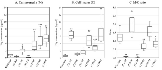 Secretion and synthesis of fibrinogen in Chinese hamster ovary cells. Fibrinogen concentrations in the culture media (A) and cell lysates (B) were measured using an enzyme-linked immunosorbent assay. Panel (C) shows the M/C ratio of the culture media to the cell lysate. Box plots and central bars show the interquartile range and median, respectively. The significance of differences between wild-type and variant fibrinogen-producing cells is shown (* p < 0.05, ** p < 0.01, *** p < 0.001).