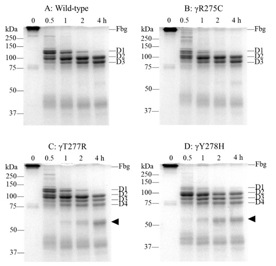 Fibrinogen degradation assay with plasmin. Recombinant fibrinogens (0.30 mg/mL) in HBS buffer containing 5 mM EDTA were incubated with 0.18 U/mL plasmin for 0–4 h at 37 °C. The fragments were analyzed by 10% SDS-PAGE and with Coomassie brilliant blue (CBB) staining. Fibrinogen (Fbg), fragments D1, D2, D3, and D4, and lower molecular weight fragment (◀) are indicated on the right side of each panel. (A) wild type, (B) γR275C, (C) γT277R, (D) γY278H.
