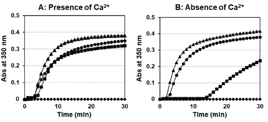 Thrombin catalyzed fibrin polymerization. The polymerization of 0.18 mg/mL recombinant fibrinogens was initiated with 0.05 U/mL thrombin in the presence of 1 mM Ca2+ (A) or absence of Ca2+ (B). ●: Wild-type, ♦: γR275C, ▲: γT277R, ■: γY278H.