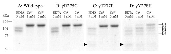 For γY278H fibrinogen, fragment D1 was cleaved into fragments D2 and D3 and lower molecular weight fragments not only in the presence of EDTA, but also in the presence of Ca2+ (Figure 6D). Moreover, all remaining fragments were less than those of wild-type. For γT277R fibrinogen, fragments D2 and D3 were cleaved in a similar way to those of γY278H in the presence of EDTA, but fragment D1 was similar to that of wild-type fibrinogen in the presence of Ca2+ (Figure 6C). On the other hand, fragments D1, D2, and D3 of γR275C fibrinogen were similar to those of wild-type fibrinogen both in the presence of EDTA or Ca2+ (Figure 6B).