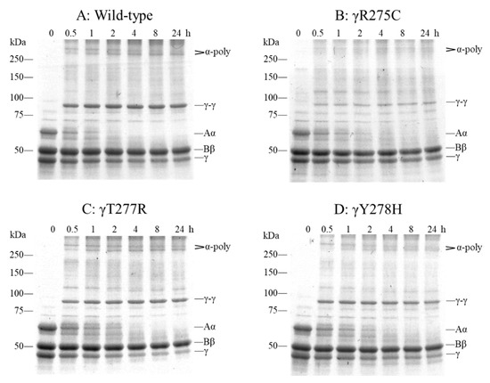 FXIIIa-catalyzed cross-linking of fibrinogen. Recombinant fibrinogens were cross-linked using FXIIIa for 0.5–24 h and examined in 8% SDS-PAGE gels in reducing conditions with CBB staining. Reduced fibrinogen chains (Aα, Bβ, γ chains, α-polymer, γ-γ dimer) are indicated on the right side of each panel. (A) wild type, (B) γR275C, (C) γT277R, (D) γY278H.
