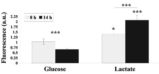 The intensity of the inhibition of ergosterol synthesis by FLC varies depending on the growth phase of C. albicans []. Thus, we investigated how high the expressions of the ERG3 and ERG11 genes are following 8 and 14 h C. albicans culture in the presence of lactate. Both genes are crucial in the sterol synthesis pathway in C. albicans []. Lactate inhibited the expression of ERG11 by approximately 10-fold more than glucose following 8 h growth of C. albicans, while ERG3 gene expression was similarly low in both phases of growth regardless of the carbon source (Figure 5).