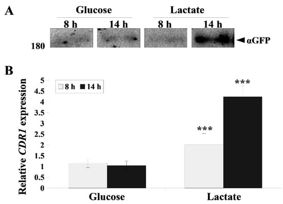 (A) Immunoblot analysis of Cdr1p levels in C. albicans ASCa1 (CDR1-GFP) strain during growth (8 and 14 h) in YPD (glucose) or YPL (lactate). The samples were resolved using 6% SDS-PAGE and probed with an anti-GFP antibody. Ponceau S staining was used as the loading control. The experiment was a representative of three independent assays, and the presented conditions were resolved in the same gel and cut out into separate lines (Figure S1 in Supplementary Materials). (B) Relative CDR1 gene expression in C. albicans during different growth phases (8 and 14 h) in YPD or YPL medium. Gene expression levels are represented as mean 2−ΔΔCT values ± SD (n = 6) normalized to 1 for 8 h YPD-grown gene expression level. Statistical analysis compared YPD- and YPL-grown strains (*** p < 0.001).
