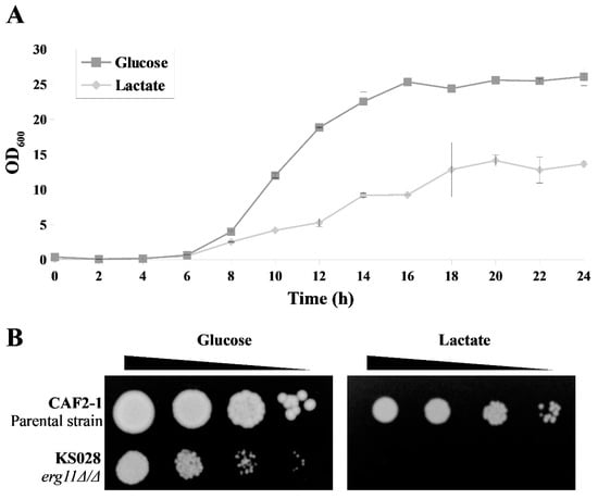 (A) Growth curves of C. albicans CAF2-1 strains in YPD (glucose) or YPL (lactate) medium (28 °C, 120 rpm), represented as OD600 (means ± SD, n = 4). (B) Growth phenotypes of C. albicans CAF2-1 (parental strain) and KS028 (erg11Δ/Δ) strains after 48 h incubation at 28 °C in YPD or YPL medium.