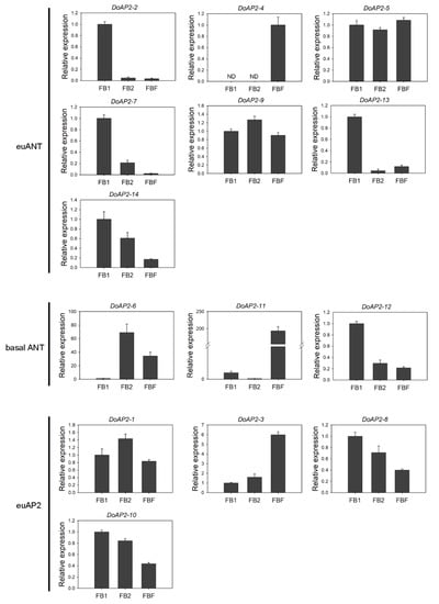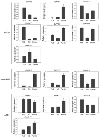 2.4. Expression Analysis of DoAP2 Genes at Different Developmental Stages