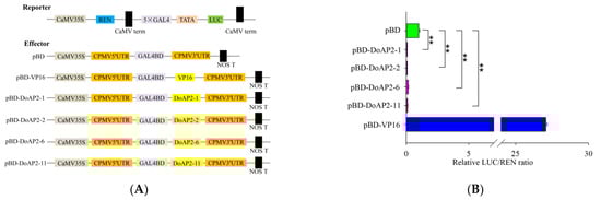 2.7. Four DoAP2 Proteins Displayed Transcriptional Repression in Tobacco Leaves