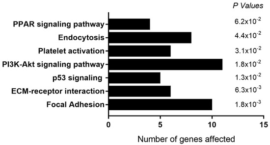 Functional classification of genes down-regulated in osteoclast precursors following exposure to 5 µg/L Co2+:Cr3+. KEGG pathways that were enriched in the differentially expressed genes, with the number of genes in each pathway and the corresponding P value are illustrated here.