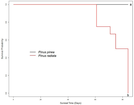 Survival probability plot determined using the Kaplan–Meier estimate of the survival function for P. pinea and P. radiata seedlings inoculated with F. circinatum. Different letters indicate significant p-values.