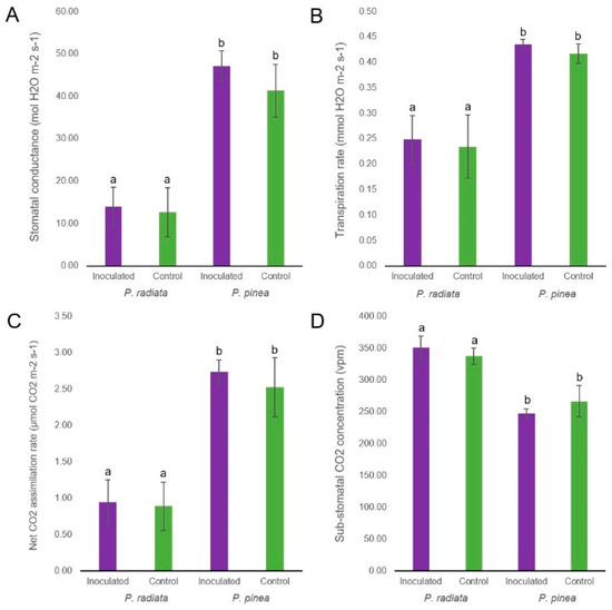 Needle gas exchange-related parameters of P. pinea and P. radiata inoculated with F. circinatum and controls at 4 dpi. (A) Stomatal conductance. (B) Transpiration rate. (C) Net CO2 assimilation rate. (D) Sub-stomatal CO2 concentration. Error bars show the standard deviation. Different letters above the bars indicate significant differences (ANOVA, p < 0.05).