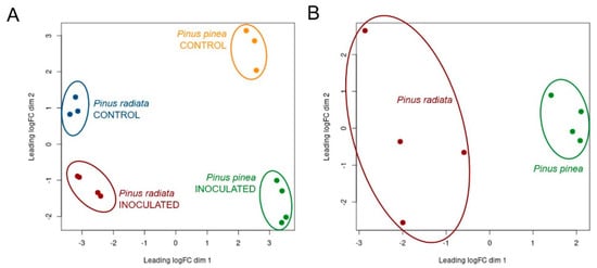 Two-dimensional scatterplot of the principal component analyses (PCA) for (A) Pinus radiata and P. pinea different treatments and (B) Fusarium circinatum infecting every host species. The distances approximate the typical log2 fold changes between the samples.