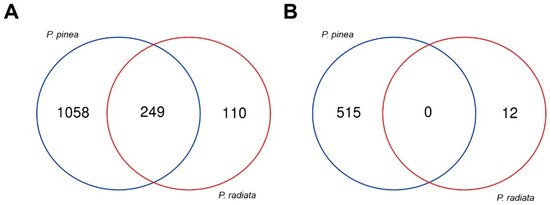 Venn diagram showing the number of P. pinea and P. radiata genes up-regulated (A) and down-regulated (B).