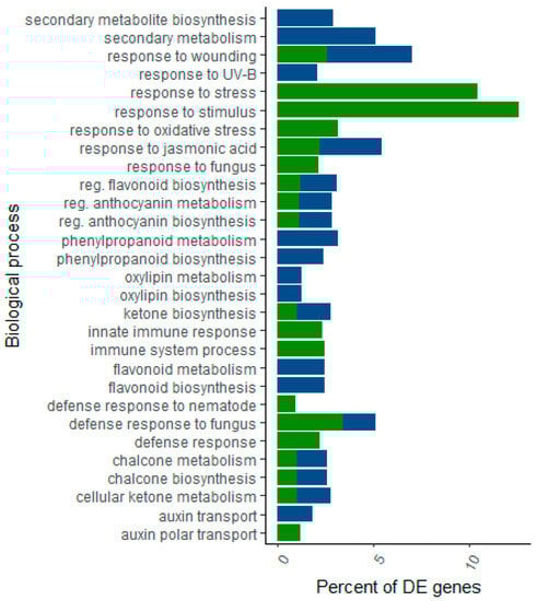 Representation of the most significantly (p < 0.05) enriched GO terms (biological processes) of the up-regulated genes of P. pinea (blue bars) and P. radiata (green bars) infected by F. circinatum.