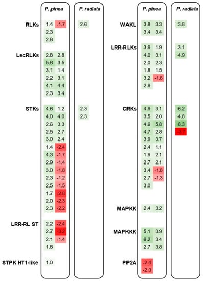 Differentially expressed genes (DEGs) with a role in signal perception. Numbers represent the log2 fold change value based on the comparison of the transcript levels between the pine seedlings infected by F. circinatum and mock-inoculated control. Groups of genes are abbreviated as follows: RLKs, receptor-like kinases; LecRLKs, lectin domain-containing receptor kinase; STKs, serine/threonine-protein kinases; LRR-RL ST, receptor-like serine/threonine-protein kinase with leucine-rich repeat domain; STPK HT1-like, serine threonine-protein kinase HT1-like; WAKL, wall-associated receptor kinase-like; LRR-RLKs, leucine-rich repeat receptor-like protein kinases; CRKs, cysteine-rich receptor-like protein kinase; MAPKK, mitogen-activated protein kinase kinase; MAPKKK, mitogen-activated protein kinase kinase kinase; PP2A, serine/threonine phosphatases type 2A.