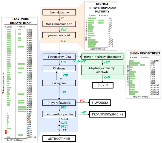 Simplified scheme of the flavonoid and lignin biosynthetic pathway. Some critical up-regulated (green) or down-regulated (red) enzymes of P. pinea are indicated and abbreviated as follows: PAL, phenylalanine ammonia-lyase; C4H, cinnamate 4-hydroxylase; 4CL, 4-coumarate: CoA ligase; CHS, chalcone synthase; CHI, flavanone isomerase; F3H, Flavanone 3-hydroxylase; DFR, dihydroflavonol 4-reductase; LDOX, leucoanthocyanidin dioxygenase; OMT, O-methyltransferase; UFGT, UDP-glucose:flavonoid 3-O-glucosyl transferase; RT, putative rhamnosyltransferase; CCoAOMT, caffeoyl-CoA O-methyltransferase; CCR, cinnamoyl-CoA reductase; CAD, cinnamyl alcohol dehydrogenase; FLS, flavonol synthase; LAR, leucanthocyanidin reductase. Individual differentially expressed genes (DEGs) with annotated functions are listed along the Y-axis for P. pinea and P. radiata. The bars in the X-axis represent the level of log2 fold change value based on the comparison of the transcript levels between the pine seedlings infected by F. circinatum and mock-inoculated control. Red bars denote the level of down-regulation, and green bars indicate the level of up-regulation.