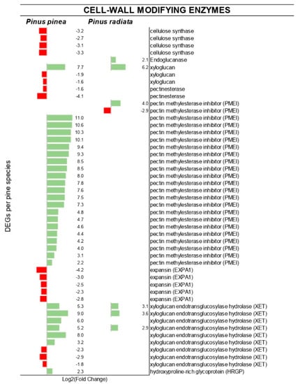 The DE of genes encoding for cell wall modifying enzymes of both pines is shown in Figure 8. Interestingly, a contrasting scenario is shown in the pectinesterase (PE) and pectin methylesterase inhibitor (PMEI) genes: while 21 genes encoding for PMEI were highly induced (up to 10.9 log2[fold change]) in P. pinea, only one did in P. radiata, and another was repressed. Additionally, two PE were down-regulated only in P. pinea. Furthermore, many genes related to lignin biosynthesis were up-regulated in P. pinea, being this number much smaller in P. radiata (Figure 7).