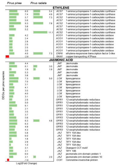 The number of genes involved in JA signaling was considerably higher in P. pinea than in P. radiata (Figure 9). While several genes encoded JA-metabolizing enzymes as jasmonate methyl transferase (JMT), and JA biosynthesis-related enzymes lipoxygenases (LOX) and 12-oxo-PDA-reductase (OPR) were up-regulated in inoculated P. pinea; only four of these were up-regulated in P. radiata. Although this could indicate activation of JA signaling, genes that encode jasmonate-zim-domain (JAZ) transcription repressors (TIFY domain-containing proteins) were also up-regulated in P. pinea and one in P. radiata; and a coronatine insensitive 1 (COI1) predicted gene, essential for the regulation of JA signaling [49], was down-regulated in P. pinea.