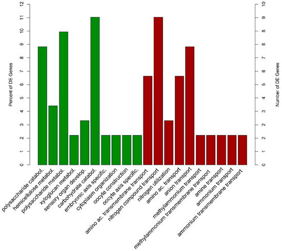 The GO enrichment analysis of the DEGs in the pathogen dataset showed a strong difference in the fungal response depending on the pine species (Table S13). The genes were DE in P. pinea relative to P. radiata; namely, the up- and down-regulated genes were significantly expressed in P. pinea with respect to P. radiata. Only a few GO terms were shared between up- and down-regulated set of genes, including carboxylic acid, organic acid, and amino acid transport. In the up-regulated gene dataset, BP terms associated with degradation of amino acids and sugars/carbohydrates (e.g., hemicellulose, xyloglucan, arginine) and the developmental and cell process were enriched (Figure 10); as well as several terms related to ornithine metabolism. Interestingly, terms related to lignin and xylan degradation were uniquely enriched in the up-regulated dataset. Almost half of the BP terms in the down-regulated dataset were related to cellular transport (Figure 10). The oxidation-reduction process, chitin catabolism, benzoate catabolism, and several terms related to fungal growth were also over-represented in the down-regulated dataset.