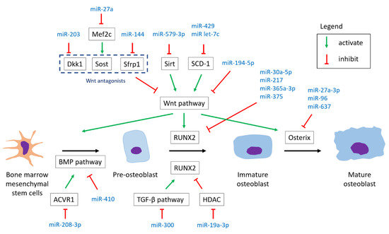 - MiR-144 and miR-203 target Wnt antagonists (Sfrp1 and DKK1, respectively), promoting osteoblast differentiation [28,43]. Besides, ovariectomized rats injected with antagomir-203 had decreased BMD over tibia and bone volume parameters compared to the control group injected with mutant antagomiR-203 six weeks after the injection [28].