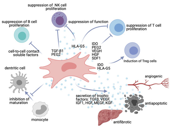 Effects of MSCs on organ regeneration through immunomodulatory and other effects. MSCs suppress T cell, B cell, and natural killer (NK) cell proliferation. They may induce regulatory T cell differentiation via secretion of indoleamine 2,3-dioxygenase (IDO) and human leukocyte antigen-G5 (HLA-G5), have an impact on the maturation of monocytes into dendritic cells, and inhibit NK and T cell function. Through secretion of soluble factors, such as growth factors, cytokines, and chemokines, MSCs contribute to tissue repair, promote angiogenesis, and prevent cell apoptosis and formation of fibrosis. (Figure created with https://biorender.com, accessed on 21 March 2021).