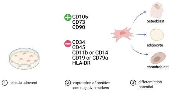 Minimal criteria for defining multipotent mesenchymal stem cells, according to the International Society for Cellular Therapy (ISCT). (Figure created with https://biorender.com, accessed on 21 March 2021). (1) MSCs must be plastic adherent in standard culture conditions. (2) Expression of CD73, CD90, CD105, and absence of the expression of hematopoietic cell surface markers CD34, CD45, CD11b or CD14, CD19 or CD79a, and HLA-DR. (3) Upon specific stimulation, MSCs must differentiate into osteoblasts, adipocytes, or chondrocytes.