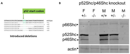 Shc proteins function as adaptor proteins participating in the formation of multiunit signaling complexes and enabling a variety of signal transduction pathways []. Three mammalian Shc genes have been identified: Shc1, Shc2, and Shc3. Shc1 is ubiquitously expressed, while expression of Shc2 and Shc3 is limited to the nervous system, where their products contribute to the development of subpopulations of both sympathetic and sensory neurons []. There are three members of Shc family of adaptor proteins encoded by Shc1 gene, namely p66Shc, p52Shc, and p46Shc. They are known to execute distinctly different actions in cells, resulting in dissimilar functions in organisms [,,]. Isoforms p46Shc and p52Shc arise from the use of alternative translation initiation sites within the same transcript, whereas p66Shc contains a unique N-terminal region and is believed to be generated by activation of alternative promoter. Due to its ability to be translocated to the mitochondria under stress conditions and facilitate production of ROS, p66Shc is generally considered to act as a sensor of oxidative stress []. p52Shc links receptor tyrosine kinases and G-protein coupled receptors with activation of Ras [,], while p46Shc was shown to inhibits thiolase and lipid oxidation in the mitochondria []. Whereas p66Shc knockouts were characterized in both mice and rats [,], much less is known about the consequences of p52Shc and p46Shc knockouts. We have recently demonstrated that even though genetic ablation of the p52Shc isoform significantly attenuated rat mammary tumor formation, p52Shc knockout rats (p52Shc-KO) do not display any phenotypic differences when compared with wild type rats []. It was reported that p46Shc isoform is up-regulated in skeletal muscle and spinal cord of 30-month-old rats []. Since specific p46Shc knockout has not yet been achieved in vivo, the exact biological significance of p46Shc signaling remains obscure.
