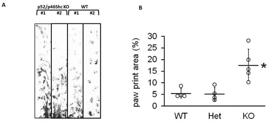 Intercrosses of heterozygous parents resulted in a reduced number of homozygous p52Shc/p46Shc-KO animals, representing 10.2% (25 out of 246) of viable progeny (p < 0.05, chi-squared test). While neither p66Shc-KO, nor p52Shc-KO rats display any phenotype differences (body size, kidney weight, appearance, and breeding) from parental SS rats [,], surviving double p52Shc/46Shc-KO rats demonstrated severe gait abnormalities in 11 days old pups through three months of age (Supplemental Video S1). Gait analysis was quantified by analyzing the total paw print (Figure 2). The abnormal gait of p52Shc/p46Shc knockout rats resulted in increased paw print area compared to wild type or heterozygous p52Shc/p46Shc littermates due to the inability to maintain normal body position when walking.