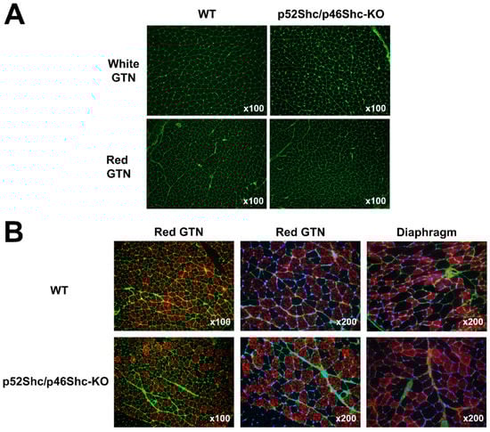 The analysis of muscle fiber type composition of red (oxidative) areas of GTN muscle and diaphragm muscle did not detect large differences between p52Shc/p46Shc-KO rats and wild type littermates (Figure 4B). There was no fiber type grouping present.
