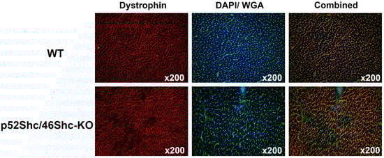 Analysis of cardiac muscle of p52Shc/p46Shc-KO rats and WT littermates. Cross-sections of heart were stained with anti-dystrophin antibody (red staining) and wheat germ agglutinin (WGA)-fluorescein (green staining). DAPI (blue staining) was used to visualize nuclei. Combined images have dystrophin, WGA-fluorescein and DAPI staining. Note large areas that are missing dystrophin staining in the heart section of p52Shc/p46Shc-KO rat.
