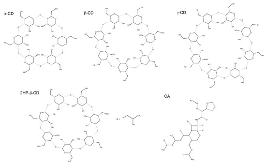 Chemical structures of cefuroxime axetil (CA) and the most common natural cyclodextrins: α-, β-, and γ-CDs as well as 2-hydroxypropyl-β-cyclodextrin (2HP-β-CD). The functionalization pattern of 2HP-β-CD was accepted according to the compound used in the present study.