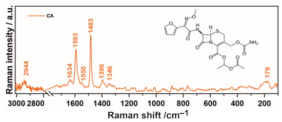 The analysis of the Raman spectrum of pure CA in the tablet form is presented in Figure 2. It confirms its identification and is compatible with literature reports [41,42]. Characteristic bands detected at 1593 cm−1 can be attributed to C=C stretching in the furanyl ring and C=N stretching vibrations in the (methoxyimino) acetyl group specific to the amorphous form of CA, bands at 1483 cm−1 are assigned to C=C stretching in the furanyl ring and C–C stretching, N–H, and CH2 scissoring modes (in CH3 group) between the furanyl ring and NOCH3 group in the (methoxyimino)acetyl group occurring both in the amorphous and crystalline form of CA, bands at 1396 cm−1 are connected with CH3 scissoring in the (acetyloxy)ethyl group and bands at 1346 cm−1 are ascribed to C–O, C–N, and CH2 stretching modes in the furanyl(methoxyimino)acetyl group. Other recorded bands at 2944, 1634, 1550 and 179 cm−1 are assigned to CH3 antisymmetric stretching, C=C stretching, C–C stretching vibrations and skeletal deformations, respectively [41,42].