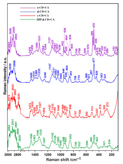 Raman spectroscopy is one of the most commonly and widely used analytical methods, applied mostly in inorganic, organic, and physical chemistry as well as in biology, pharmacy, and biomedical sciences due to its convenient appliance in identifying and determining biochemical structures of both single compounds and their mixtures [34]. This vibrational technique enables specific, cost-effective and non-destructive real-time measurements with high sensitivity, low limit of detection and no need for sample staining and special preparation. For this reason, it is often referred to as a “green analytical method”. Furthermore, it requires a small amount of studied material with high reproducibility of fast collected data and, what is equally important, the spectrometers are facile to operate and maintain [35]. The combination of Raman spectroscopy with microscopy can provide advantageous information on spatial distribution and homogeneity both within and between samples containing individual substances and their complexes and/or conjugates (pharmaceutical systems) at a microscopic level with high resolution [36]. To confirm the Raman spectroscopic data, additional methods providing information on the molecular structure of the guest–host inclusion CD+CA complexes, such as fluorescence and spectrophotometric techniques, Fourier Transform Infrared (FT-IR) and Nuclear Magnetic Resonance (NMR) spectroscopy, Scanning Electron Microscopy (SEM), Differential Scanning Calorimetry (DSC), and X-ray diffractometry, would be very helpful [37].