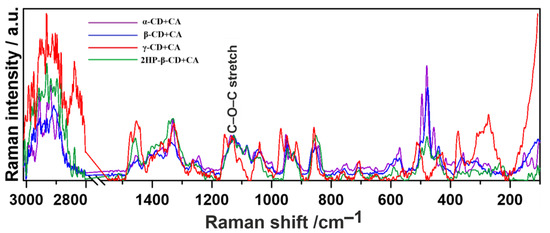 Based on the Raman spectra, the molecular arrangement and the manner of interactions in chemical complexes can also be assessed semi-quantitatively by calculations of the Raman intensity ratio parameters for the most important chemical groups involved in the CD inclusion and complexation processes, selected on the basis of the reported data [59,60]. The compilation of obtained results is presented in Table 3. Before the analysis, the spectra were normalized to the C-O-C stretching vibration bands, i.e., those appearing at 1127 cm−1 (α-CD+CA and β-CD+CA), 1133 cm−1 (γ-CD+CA) and 1126 cm−1 (2HP-β-CD+CA) (Figure 6).