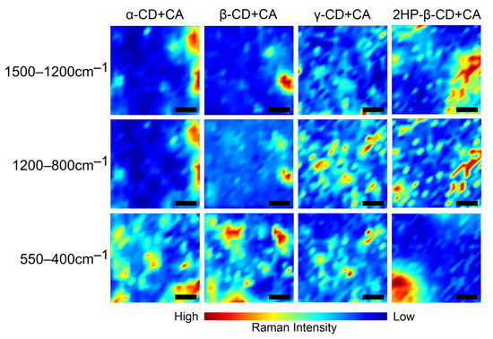 Raman spectroscopy and microscopy have been used to investigate the distribution of different chemical components at the surface of studied CD+CA tablets. The visualization (Figure 7) depicts the spatial distribution and Raman intensity of the signal of the most important chemical compounds in the xy-plane of the sample images. Differences in the composition of studied complexes indicate a distinct manner of creating molecular connections. γ-CD+CA and 2HP-β-CD+CA show a higher intensity in 1500–1200 cm−1 and 1200–800 cm−1 ranges with greater homogeneity of distribution and a lower intensity in the 550–400 cm−1 range with less homogeneity than α-CD+CA and β-CD+CA samples. This may be due to the fact that the larger inner dimensions of the cavity of γ-CD favor the deeper incorporation of the CA into the macrocyclic ring structure, forming multiple interactions that are not observed in α- and β-CDs with smaller inner cavity dimensions. In the case of 2HP-β-CD+CA, the similar result may be due to the presence of additional CH2–CH(OH)–CH3 groups, which may participate in creating different patterns of the hydrogen bond network. Imaging revealed that in both α-CD+CA and β-CD+CA complexes, the nature of interactions is quite similar.