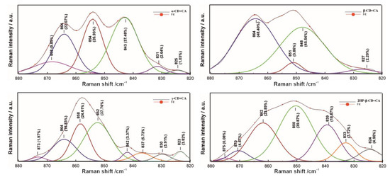 To further understand the nature of the interactions between CA and individual CDs, we performed a band deconvolution in the range of 880–820 cm−1 (Figure 8), attributed to C–C skeletal, C–O–C and CNC stretching vibrations [47,61].