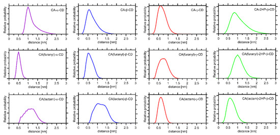 The above-discussed qualitative results can be expressed in a more quantitative manner by considering the radial distribution functions (RDFs) calculated from the unbiased MD trajectories for each of the considered complexes (Figure 11). The course of the particular RDFs reveals a varying importance of the particular parts of the CA molecule in binding to CD. More precisely, the furanyl ring plays a dominant role in the case of α- and β-CDs and a more limited one for 2HP-β- and γ-CD. On the other hand, the condensed ring structure of CA (including the lactam moiety) interacts with the inner channel of CDs only in the case of 2HP-β- and γ-CD.
