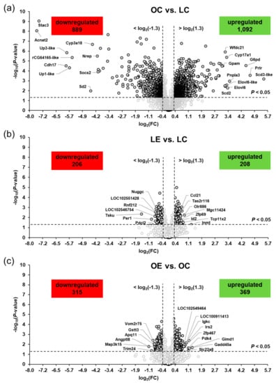 Volcano plots showing the differentially regulated hepatic transcripts between the groups OC vs. LC (a), groups LE vs. LC (b), and groups OE vs. OC (c). The double filtering criteria are indicated by horizontal (p-value < 0.05) and vertical (FC: > log2(1.3) or <log2(−1.3)) dashed lines. Transcripts in the upper left and the upper right corner represent the downregulated and the upregulated transcripts, respectively. Abbreviations: LC, lean rats fed without ecdysterone; LE, lean rats fed with ecdysterone; OC, obese rats fed without ecdysterone; OE, obese rats fed with ecdysterone.