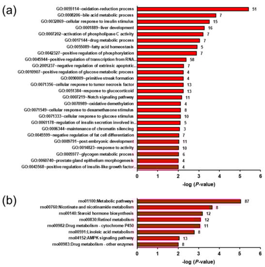 Enriched gene ontology (GO) biological process terms (a) and KEGG pathways (b) assigned to the genes downregulated in the liver of group OC (obese rats fed without ecdysterone) vs. LC (lean rats fed without ecdysterone). GO terms and KEGG pathways are sorted by their enrichment p-values (EASE score) (top: lowest p-value, bottom: highest p-value). Only GO terms and KEGG pathways with p-values < 0.001 and p-values < 0.01, respectively are shown. The number of genes is shown next to the bars.
